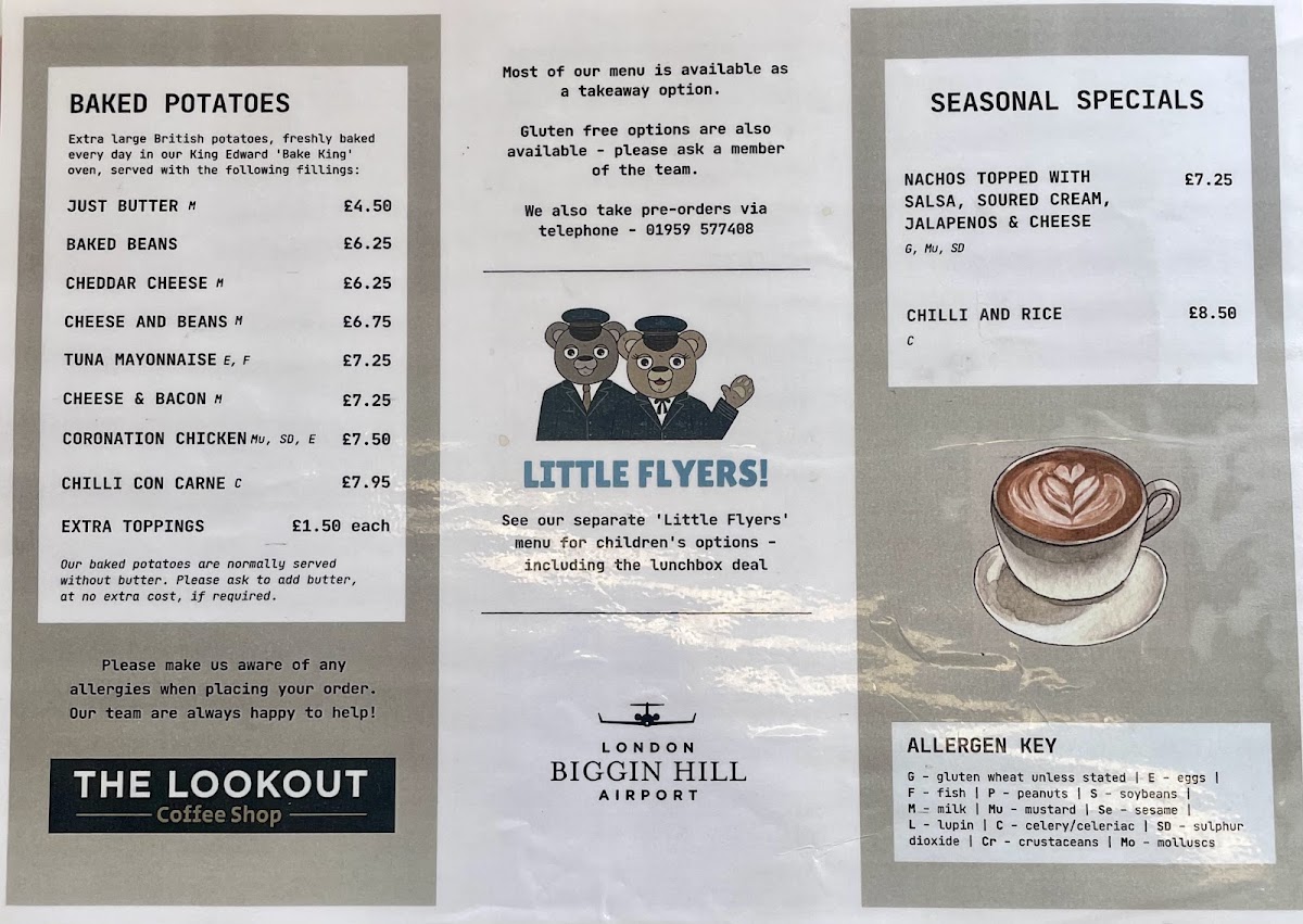 Welcome to The Lookout Coffee Shop, a delightful gem nestled in Maitland View, Westerham. This local treasure not only serves a rich selection of Costa coffee but also offers an extensive menu of snacks and light lunches, perfect for both casual diners and aviation enthusiasts. Visitors rave about the freshly prepared meals, including a generous salad paired with a delicious roasted vegetable tart, ensuring a delightful dining experience.